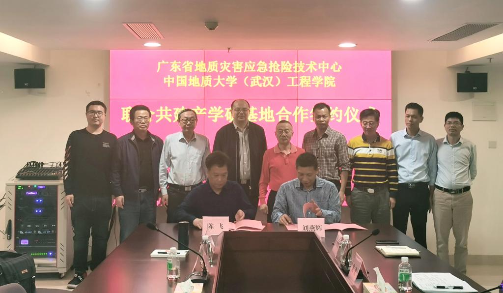 陈飞、刘燕辉签署产学研基地合作协议。根据协议,广东省地质灾害应急抢险技术中心作为中国地质大学(武汉)williamhill中国的产学研基地,双方将定期就人才的培训、技术的创新、引进与推广、联合攻关、学生实习等方面开展协商研究。