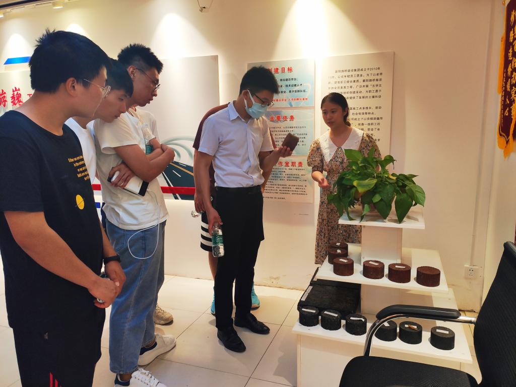在襄阳路桥建设集团有限公司工业园项目现场,工作室成员一行听取了沥青路面施工项目介绍,并参观单位研发部门“游巍工作室”。
