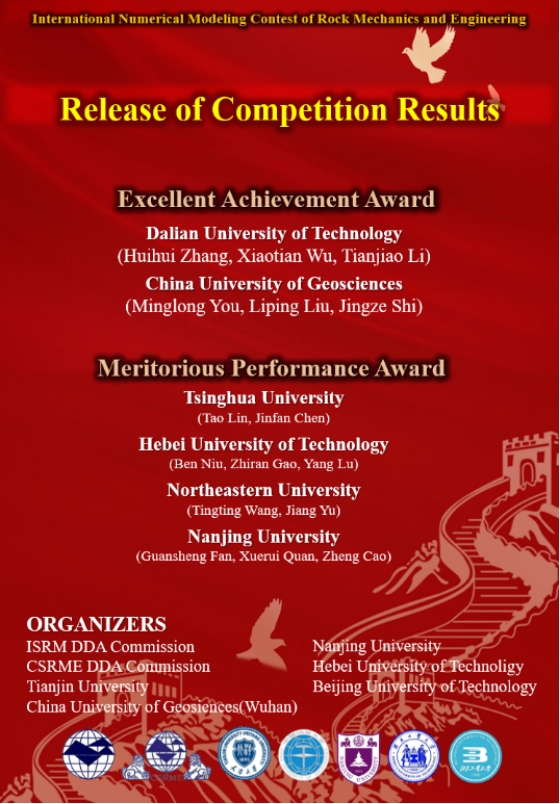 本次大赛由国际岩石力学与岩石工程学会非连续变形分析专委会(ISRM DDA)联合中国岩石力学与工程学会岩土体非连续变形分析专委会(CSRME DDA)及中国地质大学(武汉)、天津大学、南京大学、北京工业大学、河北工业大学等多所高校联合举办,于2021年第十一届亚洲岩石力学大会(ARMS11)期间同步举行。大赛鼓励研究生对岩石力学问题的现有数值方法和软件进行公开、透明和广泛的验证,为共享岩石力学问题的实验和数值结果提供平台。