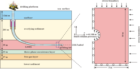 鉴于此,中国地质大学(武汉)williamhill中国宁伏龙教授团队根据南海神狐海域第一次试采站位的地质资料,构建了水合物储层水平井钻进状态模型(图1)。详细研究了不同钻井液性能、水合物饱和度以及束缚水饱和度对钻进过程中井筒状态的影响规律。并在此基础上,讨论了井筒内二次水合物生成的潜在区域以及低渗泥皮形成对井壁稳定的影响。