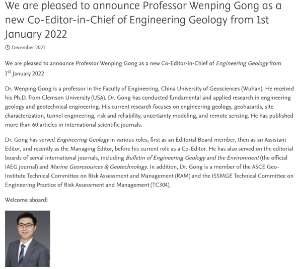 (通讯员:黄静)近日,williamhill中国龚文平教授受邀担任国际期刊Engineering Geology共同主编(Co-Editor-in-Chief)。龚文平教授的此次任职将有助于促进我校在工程地质相关领域与国内外学者的交流合作,并提升我校在工程地质相关领域的国际影响力。
