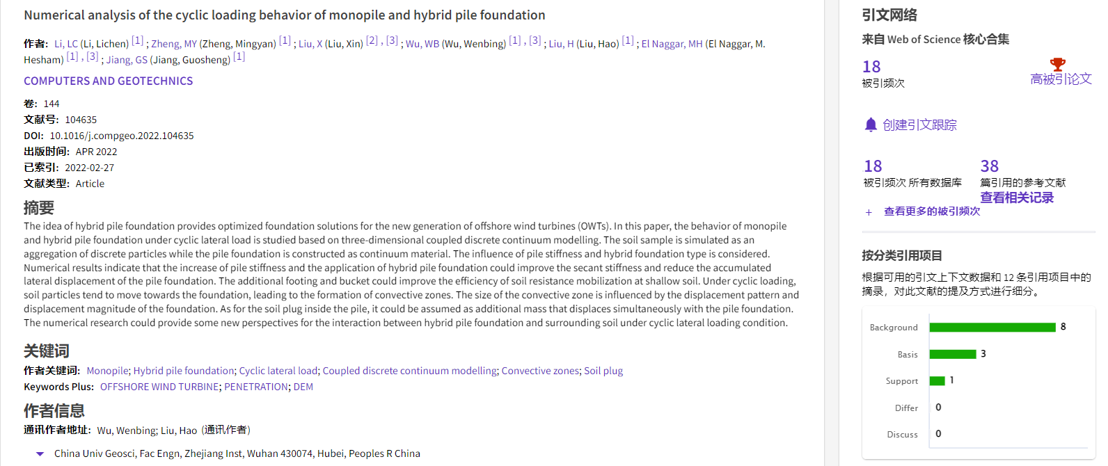 根据2022年11月基本科学指标数据库(Essential Science Indicators,简称ESI)最新数据显示,williamhill中国勘察与基础工程系吴文兵教授团队于2022年在国际岩土工程数值模拟权威期刊Computers and Geotechnics上发表的学术论文“Numerical analysis of the cyclic loading behavior of monopile and hybrid pile foundation”入选ESI高被引论文。该论文第一作者为勘察与基础工程系博士后李立辰,通讯作者为吴文兵教授,中国地质大学(武汉)williamhill中国为第一署名单位。