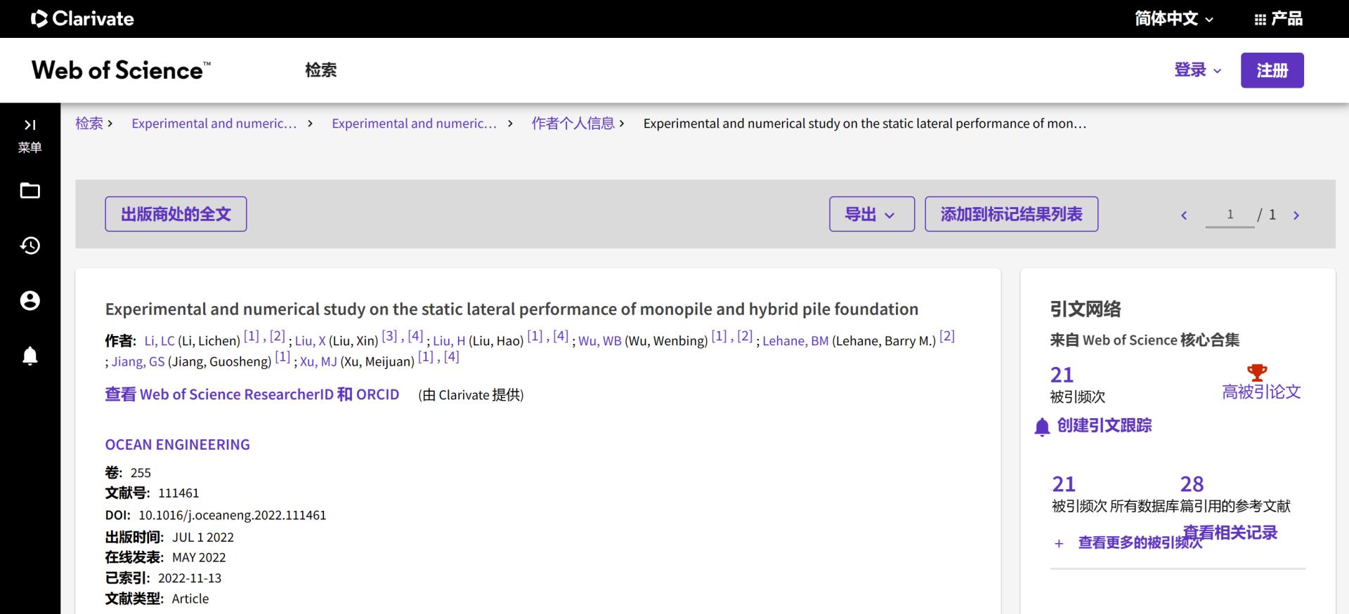 (通讯员 吴文兵)根据2023年6月基本科学指标数据库(Essential Science Indicators,简称ESI)最新数据显示,williamhill中国勘察与基础工程系蒋国盛教授团队于2022年在国际海洋岩土领域权威期刊Ocean Engineering上发表的学术论文“Experimental and numerical study on the static lateral performance of monopile and hybrid pile foundation”入选ESI高被引论文。该论文第一作者为勘察与基础工程系博士后李立辰,通讯作者为吴文兵教授,中国地质大学(武汉)williamhill中国为第一署名单位。