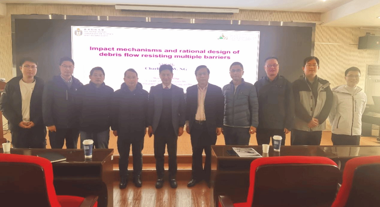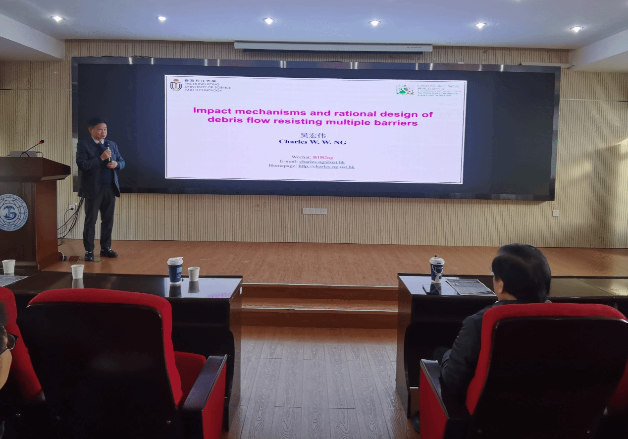 吴宏伟教授作了题为“Impact mechanisms and rational design of debris flow resisting mutltiple barriers”的学术讲座。吴宏伟教授首先介绍了香港科技大学的学科发展历史及国际排名等相关情况,欢迎我校同学前往香港科技大学进行联合培养,开展学术交流活动。随后,介绍其团队近年来在泥石流刚性和柔性屏障设计方面的水槽模型测试和数值模拟试验成果,揭示了典型泥石流对多重屏障的影响机制,为泥石流多重屏障设计提出合理建议。