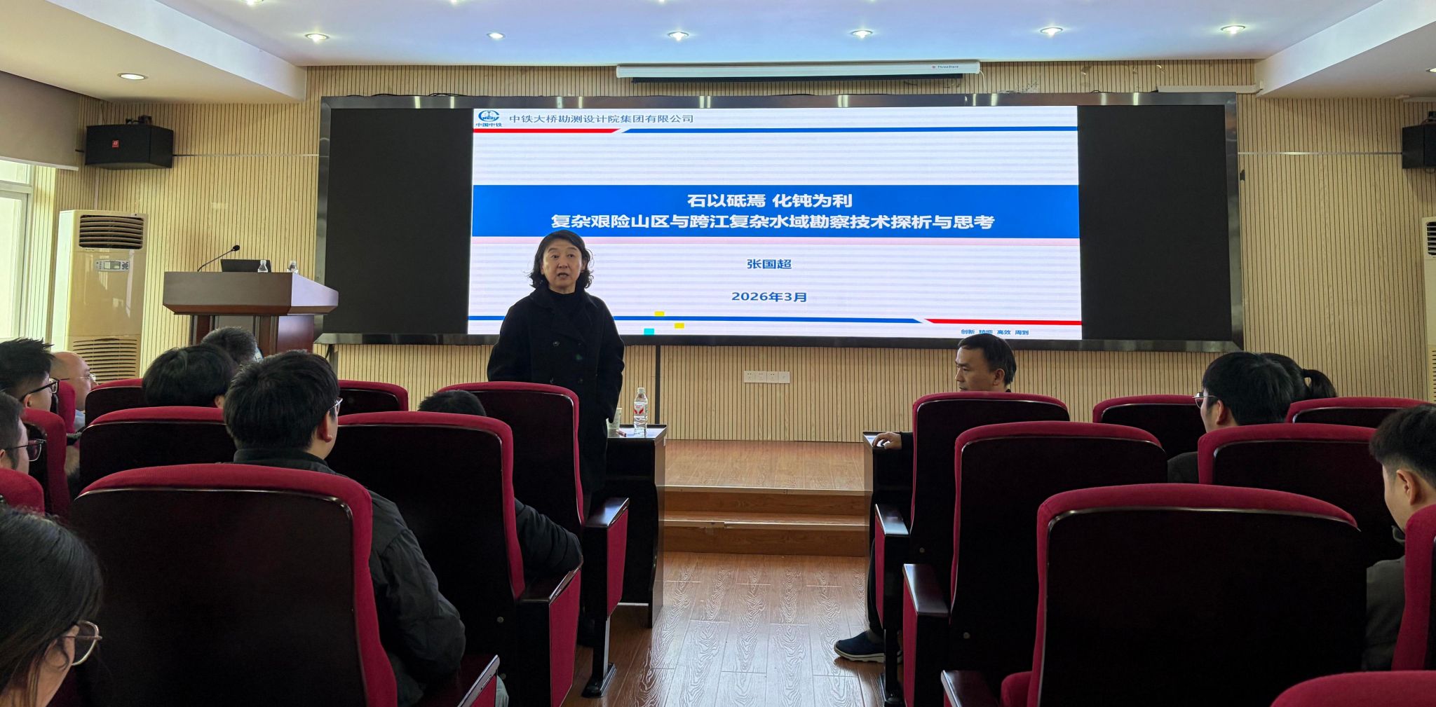 张国超正高级工程师的学术报告题目为“石以砥焉,化钝为利:复杂艰险山区与跨江复杂水域勘察技术探析与思考”。他以高原铁路金沙江特大桥、赤壁长江公路大桥、海太长江隧道等重大工程项目勘察实践为基础,结合自身一线工作成长经历,深入剖析了复杂艰险山区与跨江复杂水域场景下工程勘察的重点、难点及相应解决方案。立足于当前人工智能快速发展的时代背景,他阐述了野外踏勘工作不可替代的重要性,凸显了地质工作者深耕一线的宝贵品质。同时,结合现实工作中所遇到的各种困难,他强调了坚定信念的重要作用,并分享了依托优质平台与高效团队推动个人成长与工程实践的宝贵经验。最后,他结合实际项目经验,阐明了工程实践与科学研究之间是相辅相成、相互成就的关系,鼓励同学们要研究落地,服务社会。