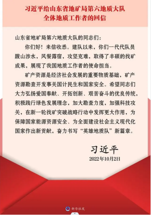 10月2日,中共中央总书记、国家主席、中央军委主席习近平给山东省地矿局第六地质大队全体地质工作者回信。回信中,习近平总书记深刻阐述了矿产资源及其勘查开发在经济社会发展中的重要作用,就弘扬优良传统、做好矿产勘查工作提出殷切期望。