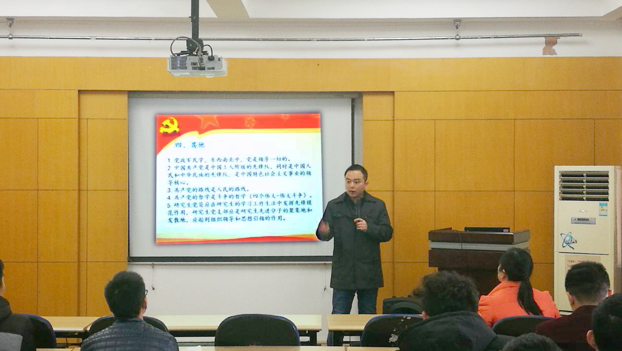 徐伟为研究生学员们讲解研究生支部建设和示范党支部创建中的一系列问题。他以习近平总书记在十九大报告中加强对基层组织的建设引出基层党组织的功能与作用,并提出研究生这个高知识群体对国家、社会的作用。随后,他为学员们讲解了研究生示范党支部创建工作应该如何开展并提出了相关对策和建议。